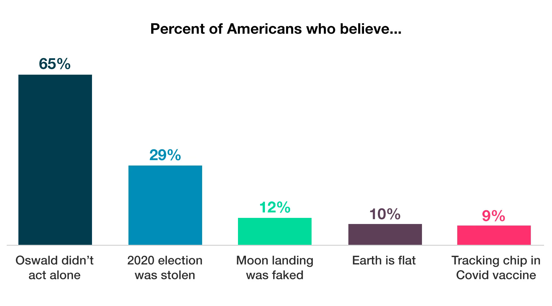If a president were assassinated today, would there be anything but conspiracy theories? Could you even get a bipartisan cross-sample of respected politicians to align on a Warren-style report? The 35% of us who believe the official Kennedy story is high compared to what we’d get if a modern-day Lee Harvey Oswald pulled a similar stunt.