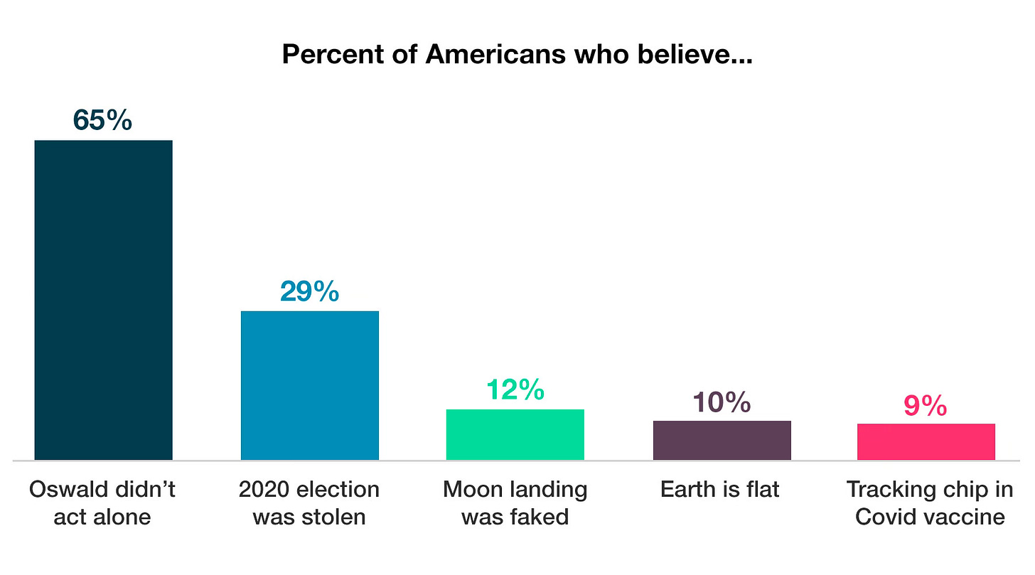 If conspiracy theories are the Great American Art Form, there’s no question as to which is the canonical work of art—our Kind of Blue, West Side Story, Superman, and Illmatic all rolled into one: the theories surrounding the 1963 assassination of our third-best president named “John,” John Fitzgerald Kennedy1. The belief that Lee Harvey Oswald didn’t act alone is the country’s most widely-believed conspiracy theory—if, indeed, it even is a conspiracy theory—sustained across generations and deeply woven into American cultural memory through countless books, movies, and TV shows.