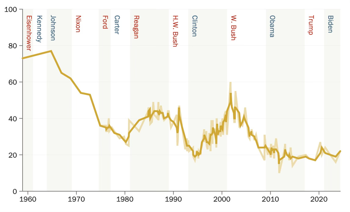 From today’s vantage point, it seems comically naive that anyone involved in the Warren Commission ever thought an official government report was all it would take to stamp out conspiracy theories. But 1964 was a different time: 77% of Americans back then said they trusted the federal government to do what is right “just about always” or “most of the time.” That was the highest that number has ever been. Over the next few years, it began a sharp downward plummet, and except for a brief and probably illusory post-9/11 spike, it hasn’t crossed 50% since. Today, it stands at just 22%.